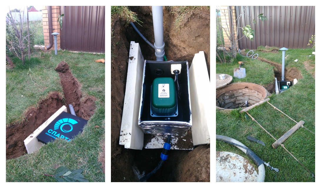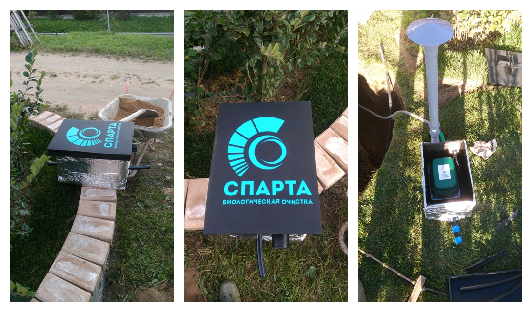 Также как и в случае скрытого варианта размещения станции биологической очистки СПАРТА, компрессор биореактора монтируется в специальном боксе ниже уровня грунта. Воздухозаборную трубу можно отвести в удобное место на участе, или расположить непосредственно в месте расположения бокса с компрессором.